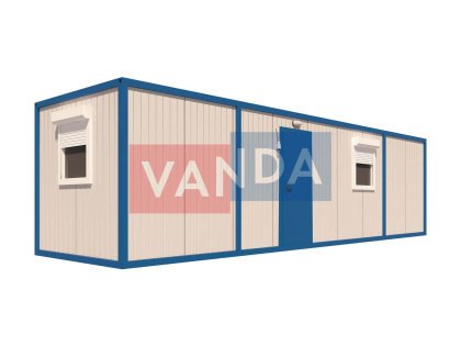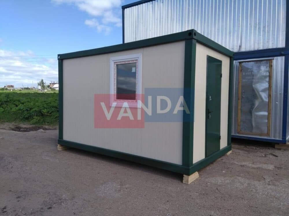 Контейнер состоит из металлического сварного основания. Стены изготовлены из сэндвич-панелей с прокладкой утеплителя. Крыша покрыта крашенным холоднокатаным металлом 1,2 мм. Помещение обустроено пароизоляцией при помощи технической пленки, которая проложена на полу и потолке. Внутренняя облицовка потолка выполнена из ПВХ-панелей, пол – из шпунтованной доски. Вход в помещение оборудован запирающейся металлической дверью.